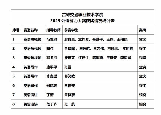 2025 年吉林省高职高专“外研社・国才杯”“理解当代中国” 外语能力大赛落下帷幕。我校学子在英语演讲、写作和短视频三个赛项中奋勇拼搏,凭借扎实的外语功底与出色的综合素养,斩获金奖 3 项、银奖 4 项、铜奖 1 项,在全省高职高专院校中展现出强劲的外语实力与育人成效。
