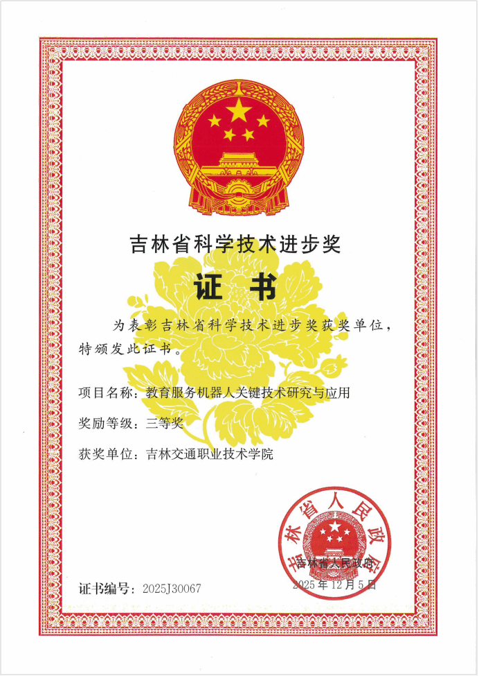 近日,吉林省人民政府颁发2025年度科学技术奖获奖证书,我校由方健教授申报的“教育服务机器人关键技术研究与应用”项目荣获吉林省科技进步奖三等奖,这一突破性成果不仅填补了学校在省级科技奖励领域的历史空白,更成为学校立足职业教育特色、以科技创新驱动高质量发展的重要里程碑。