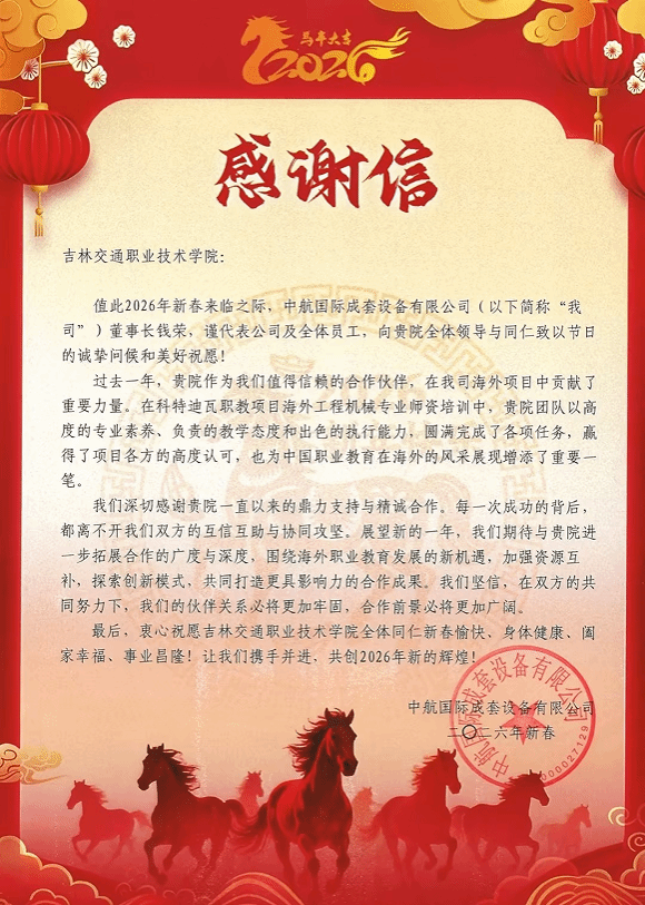 春节前夕,中航国际成套设备有限公司向我校发来新春感谢信,对学校2025年科特迪瓦职教项目师资团队的杰出贡献表达了高度认可与诚挚感谢,并对全校师生致以新春祝福。