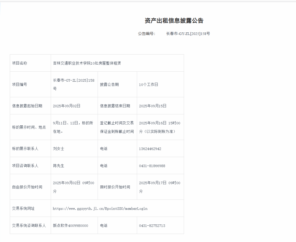 以下内容由出租方提供,吉林省公共资源交易中心完全依照出租方所提供文本照实发布,未尽事宜请意向承租方自行向出租方标的展示联系人了解,联系方式详见项目公告。