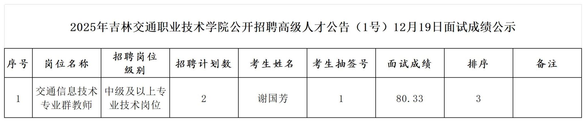 2025年12月19日的公开招聘面试成绩公示期满后,交通信息技术专业群教师(中级及以上专业技术岗位)面试成绩前两名考生主动放弃入职资格。