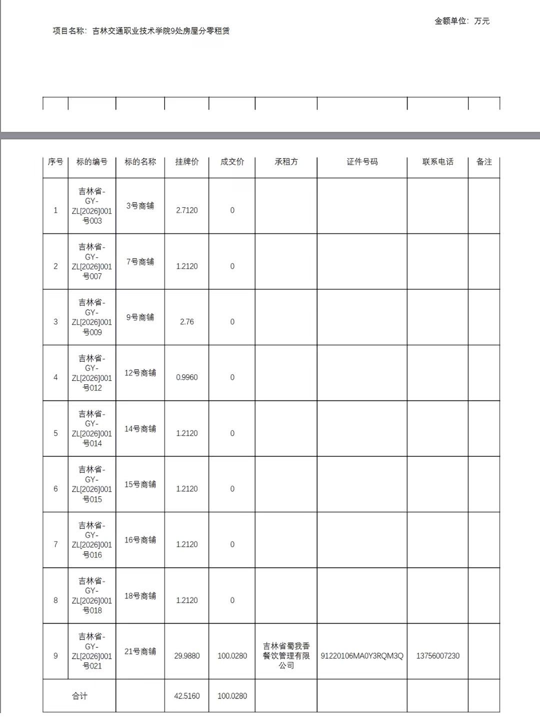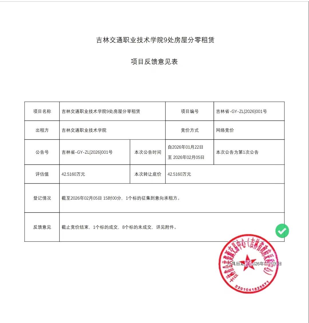 吉林交通职业技术学院9处房屋分零租赁项目反馈意见表