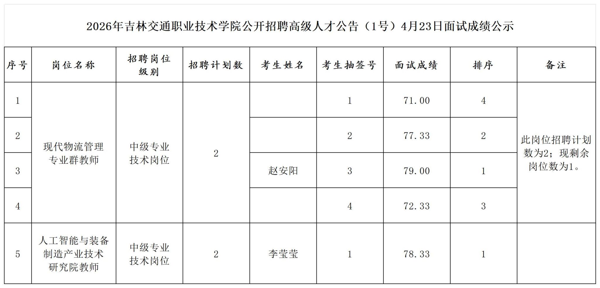 根据《2026年吉林交通职业技术学院公开招聘高级人才公告(1号)》有关规定,现将4月23日面试结果进行公示,公示期为5个工作日,自2026年4月23日至2026年4月29日。